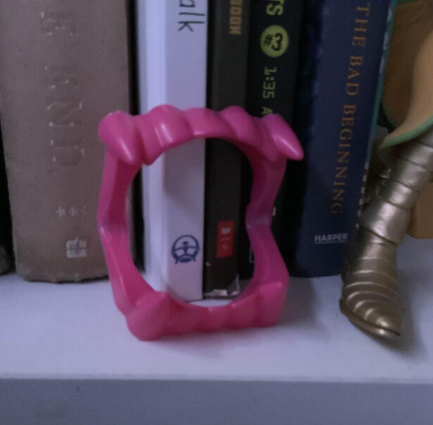 3/16/2024 Pink FangsI went to Chuck E Cheese with my family and had won most of the tickets, I saw a pair of pink fangs and got them for 60 tickets, I went home and put them on the shelf right next to the shrine